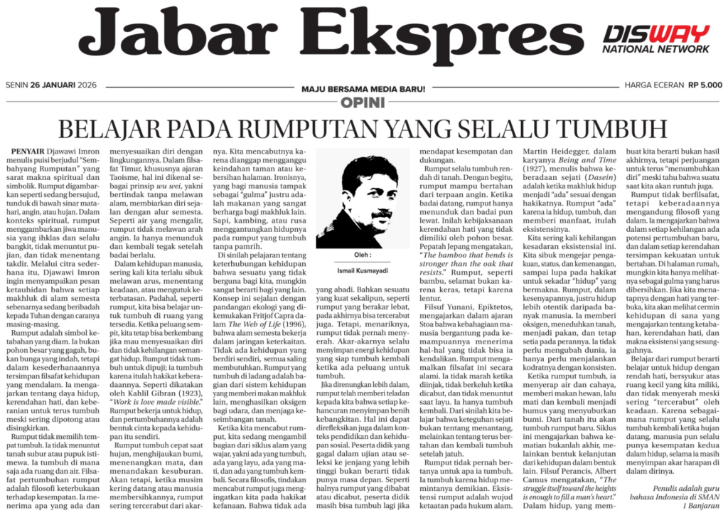 BELAJAR PADA RUMPUTAN YANG SELALU TUMBUH merupakan refleksi filosofis dan spiritual yang ditulis oleh Bapak Ismail Kusmayadi dengan menjadikan rumput sebagai simbol kehidupan. Melalui pembacaan puisi “Sembahyang Rumputan” karya Djawawi Imron dan dialog dengan berbagai pemikiran filsafat, artikel ini mengajak pembaca merenungkan makna kerendahan hati, ketabahan, dan keberanian untuk terus tumbuh di tengah keterbatasan. Rumput, […]