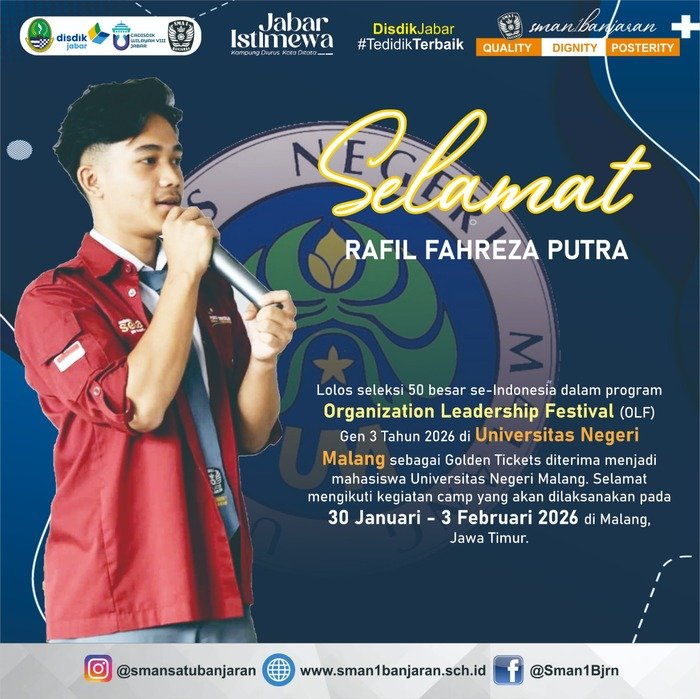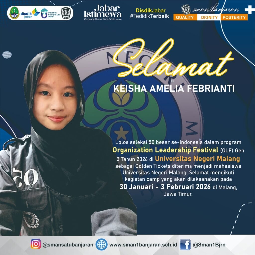 Selamat kepada Rafil Fahreza Putra dan Keisha Amelia Febrianti yang berhasil lolos 50 besar nasional dalam program Organization Leadership Festival (OLF) Gen 3 Tahun 2026 di Universitas Negeri Malang dan meraih Golden Ticket sebagai calon mahasiswa UM. Teruslah melangkah, menginspirasi, dan membawa nama baik sekolah. SMAN 1 Banjaran bangga padamu! #Quality #Dignity #Posterity